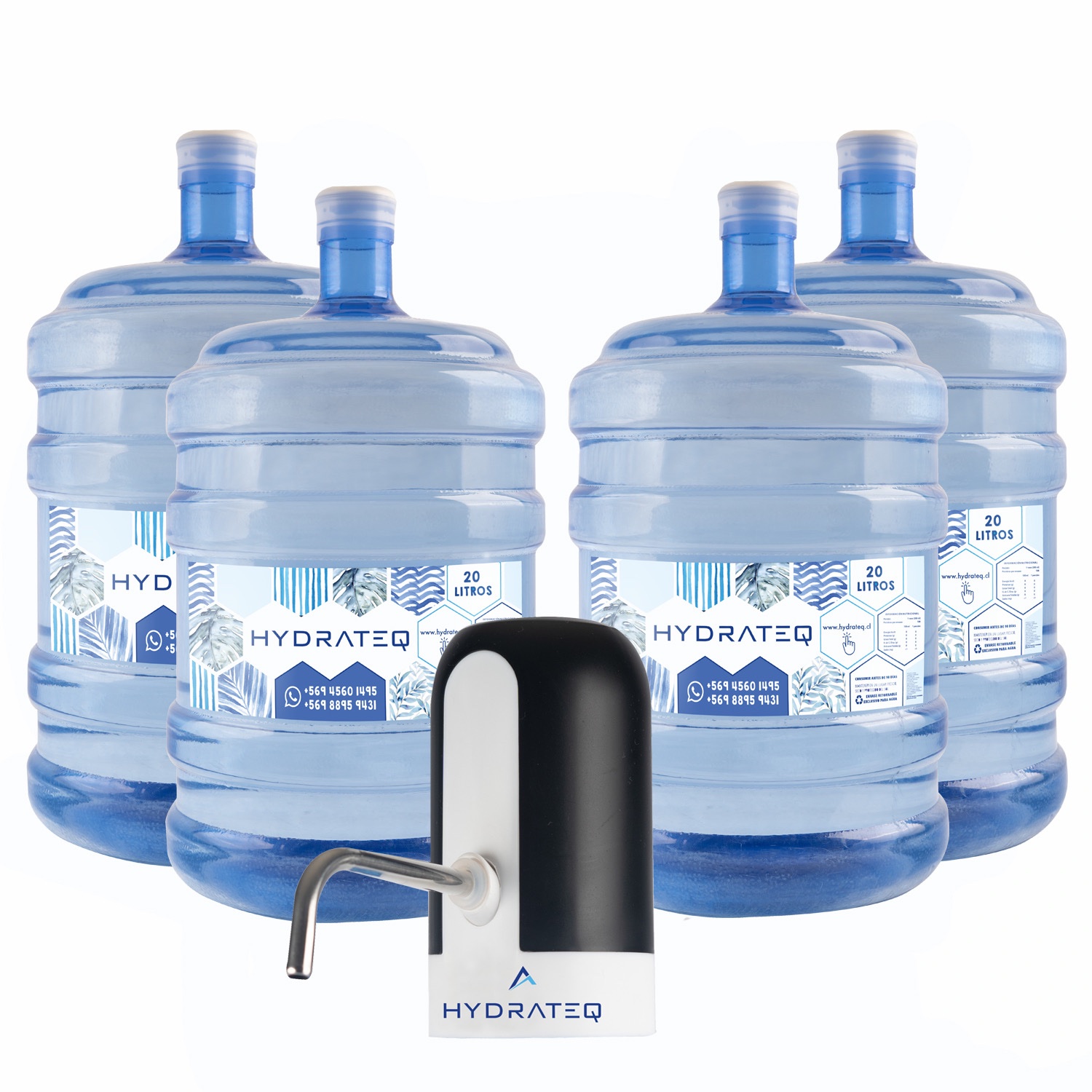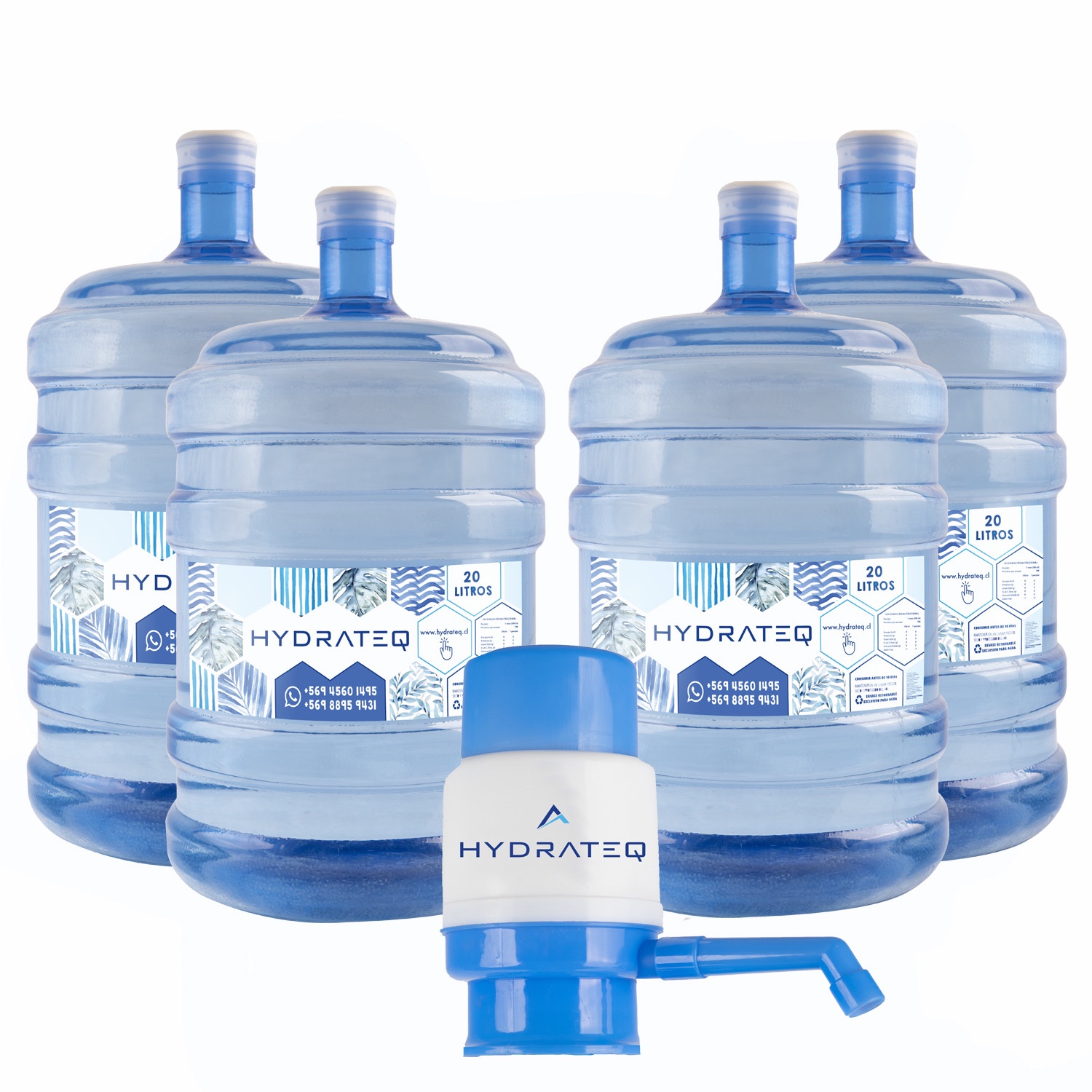 Pack incluye: 1 Bomba Manual + 2 Bidones de 20 litros de Agua Purificada. Con sus respectivos envases. Así, en la siguiente compra sólo nos solicitas las Recargas porque ya tienes los envases.